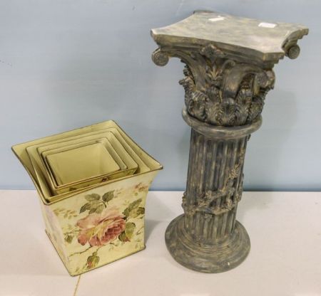 2922 Four Tin Flowered Planters & Resin Small Pedestal