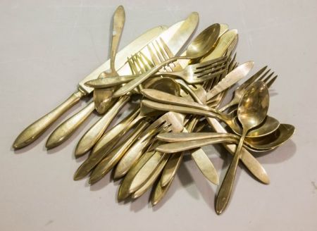 Seven brass plated knives, six dinner forks, eight salad forks & nine spoons Seven brass plated knives, six dinner forks, eight salad forks & nine spoons