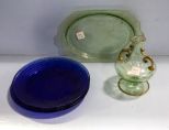2300 Four Cobalt Plates, Green Depression Glass Tray & Green Vase