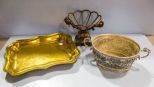Ceramic painted gold 20"x 15 1/2" serving tray, lacquered silvertone centerpiece and resin centerpiece frame Ceramic painted gold 20"x 15 1/2" serving tray, lacquered silvertone centerpiece and resin centerpiece frame