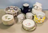 Covered oriental bowl (broken), yellow check saucers, saucers, ramekins, cookie jar and teapot Covered oriental bowl (broken), yellow check saucers, saucers, ramekins, cookie jar and teapot