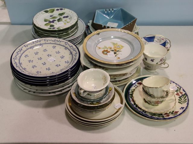 Including banquet blue plates, herb garden plates, Italian salad plates, Fitz and Floyd bird plates, miscellaneous cups and plates Including banquet blue plates, herb garden plates, Italian salad plates, Fitz and Floyd bird plates, miscellaneous cups and plates