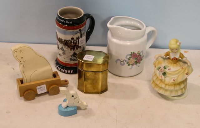 Budweiser stein, pitcher, figurine, brass box, wagon with paper cats and wooden rabbit Budweiser stein, pitcher, figurine, brass box, wagon with paper cats and wooden rabbit