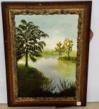 3044 Oil on Board of Trees and Lake in Oak Frame