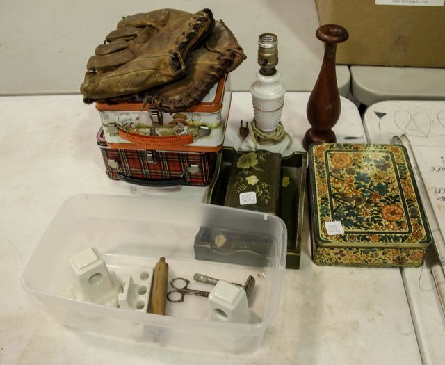 Two lunchboxes, two baseball gloves, milk glass lamp, metal box, wood box, wood tray, porcelain toothbrush holder & towel holder Two lunchboxes, two baseball gloves, milk glass lamp, metal box, wood box, wood tray, porcelain toothbrush holder & towel holder