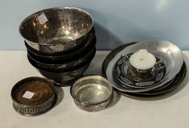 Pewter golf trays, two brass Holland plates, four silverplate bowls and three silverplate coasters Pewter golf trays, two brass Holland plates, four silverplate bowls and three silverplate coasters