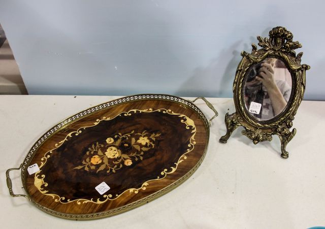 3076 Oval Inlaid Tray & Brass Table Top Mirror