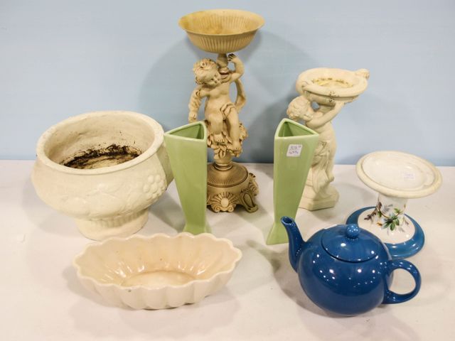 Two green pottery vases, white oval planter, blue teapot, plaster planter and pedestal Two green pottery vases, white oval planter, blue teapot, plaster planter and pedestal