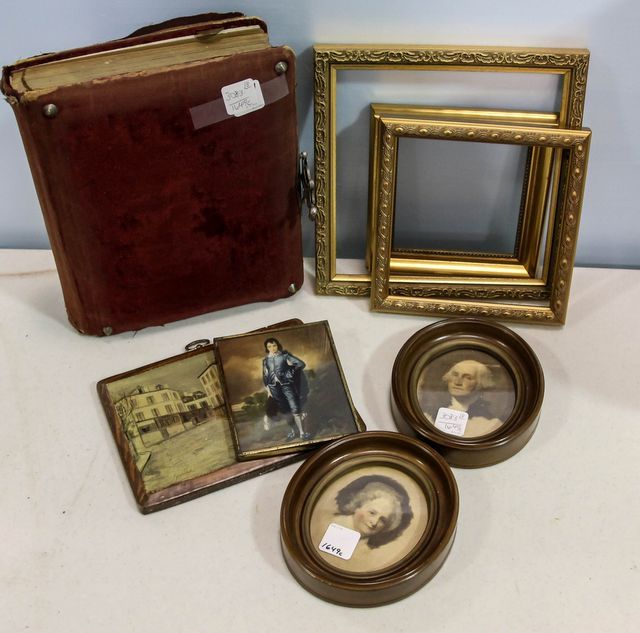 Photo album, miniature frames of George and Martha, miniature Blue Boy and three gold frames Photo album, miniature frames of George and Martha, miniature Blue Boy and three gold frames