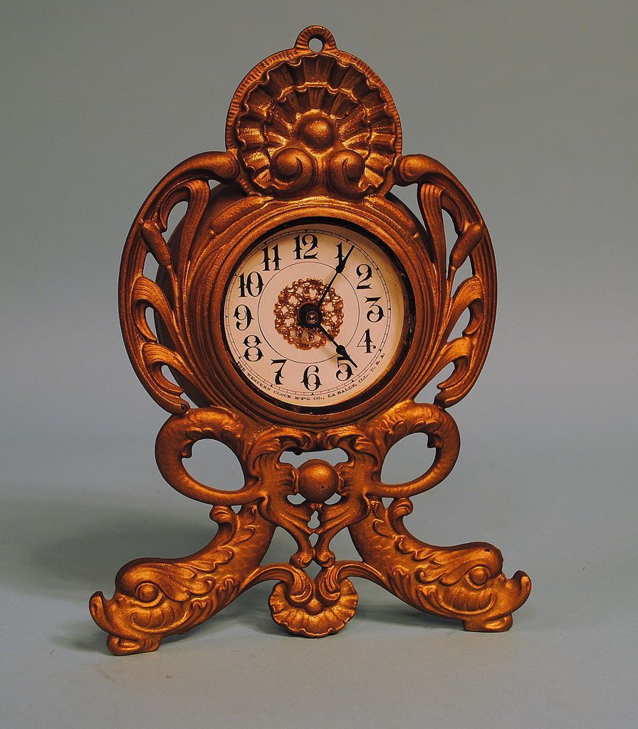 Western Clock MFC, Company, Patent 1902. Clock in Classical Design Brass Frame with Shell and Dolphin Motif. 8 3/4"h 8"w Western Clock MFC, Company, Patent 1902. Clock in Classical Design Brass Frame with Shell and Dolphin Motif. 8 3/4"h 8"w
