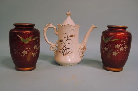 Pair of Red Lacquer Vases painted in Oriental Design simulating Cloisonne. Floral with Green birds, gold rim 6"h, along with a Lefton China tea pot, 8 1/2"h Pair of Red Lacquer Vases painted in Oriental Design simulating Cloisonne. Floral with Green birds, gold rim 6"h, along with a Lefton China tea pot, 8 1/2"h