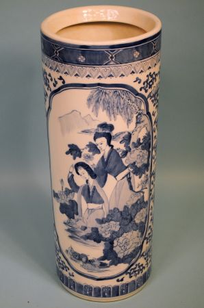 Blue and White Umbrella Stand with painting of Geisha Girl on each side. 8 1/2" dia. 22"h Blue and White Umbrella Stand with painting of Geisha Girl on each side. 8 1/2" dia. 22"h