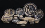 Blue Willow China, 1960's Churchill England/Heritage Mint. 125 pcs. (17 dinner plates(2 chipped), 11 salad bowls, 3 divided vegetable, 2 covered casserole, 3 large charger plates, 12 bread plates (1 chipped), 7 soup bowls, 10 dessert bowls (2 chipped), 6 cups ( 1 broken handle), 14 saucers (2 chipped), 8 broth cups (1 chipped), 12 tea cups, 7 ramekin bowls (Heritage Mint), 2 pairs cream & sugar (Churchill), 3 handled bowls (Heritage Mint), 6 white finger bowls. Blue Willow China, 1960's Churchill England/Heritage Mint. 125 pcs. (17 dinner plates(2 chipped), 11 salad bowls, 3 divided vegetable, 2 covered casserole, 3 large charger plates, 12 bread plates (1 chipped), 7 soup bowls, 10 dessert bowls (2 chipped), 6 cups ( 1 broken handle), 14 saucers (2 chipped), 8 broth cups (1 chipped), 12 tea cups, 7 ramekin bowls (Heritage Mint), 2 pairs cream & sugar (Churchill), 3 handled bowls (Heritage Mint), 6 white finger bowls.