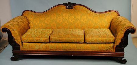 1920's Mahogany Empire Transitional Style Sofa. Carved birds on each arm and floral center crest. 86"w 36"h 31"d 1920's Mahogany Empire Transitional Style Sofa. Carved birds on each arm and floral center crest. 86"w 36"h 31"d