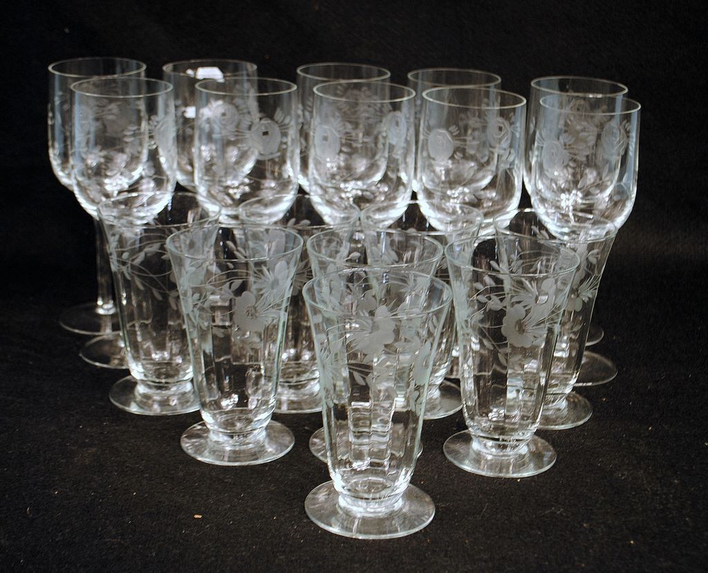 Set of Ten etched wine glasses, 8"h, and eight water glasses etched with roses, 5.5"h. Set of Ten etched wine glasses, 8"h, and eight water glasses etched with roses, 5.5"h.