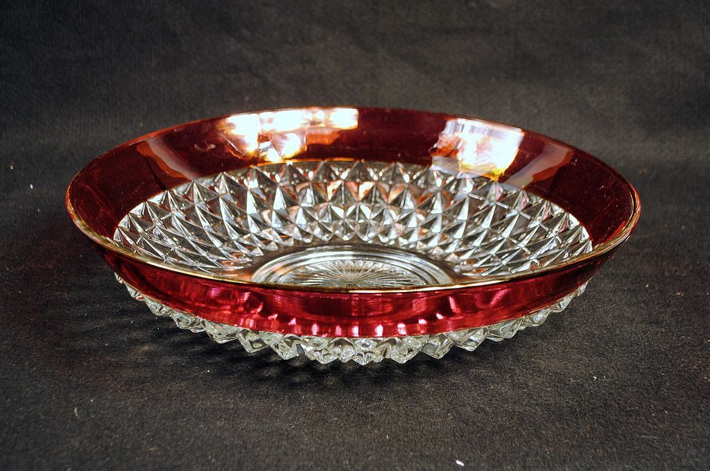 Diamond Point Bowl with Ruby Stain. Diamond Point was made by the Indiana Glass Company in the 1960's. The bowl is in good condition with no chips or cracks. 13.5"w Diamond Point Bowl with Ruby Stain. Diamond Point was made by the Indiana Glass Company in the 1960's. The bowl is in good condition with no chips or cracks. 13.5"w