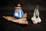 Wedgewood and Brass Inkstand and Glass Paperweight with applied leaves Wedgewood classical design on 8 1/2" ornate brass base. Paperweight multi-color, three balls, 5"h Wedgewood and Brass Inkstand and Glass Paperweight with applied leaves Wedgewood classical design on 8 1/2" ornate brass base. Paperweight multi-color, three balls, 5"h