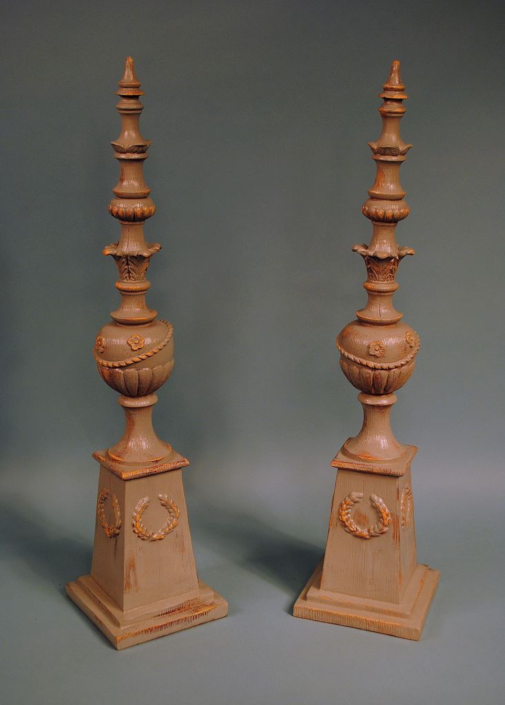 Pair "Shabby Chic" light blue Urns on obelisk style bases, 25 1/2"h Pair "Shabby Chic" light blue Urns on obelisk style bases, 25 1/2"h