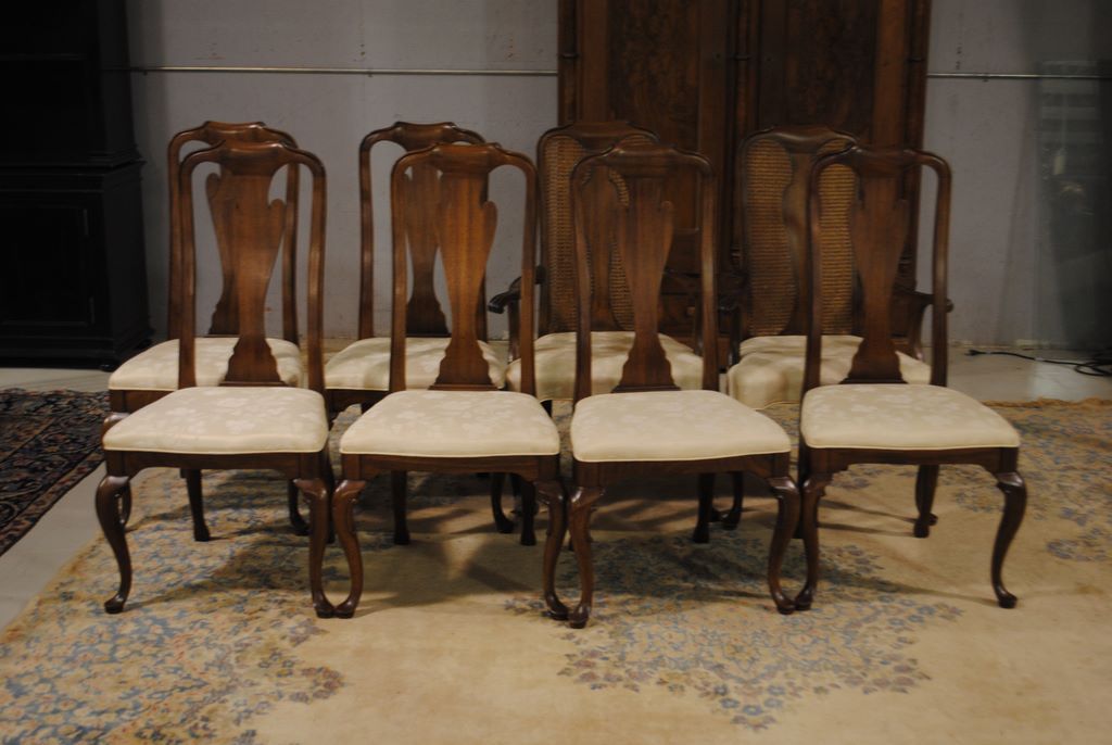 Set of Eight Contemporary Queen Anne Dining Chairs. Six side chairs and two arm chairs. The arms having decorative two section cane backs. 42"h Set of Eight Contemporary Queen Anne Dining Chairs. Six side chairs and two arm chairs. The arms having decorative two section cane backs. 42"h