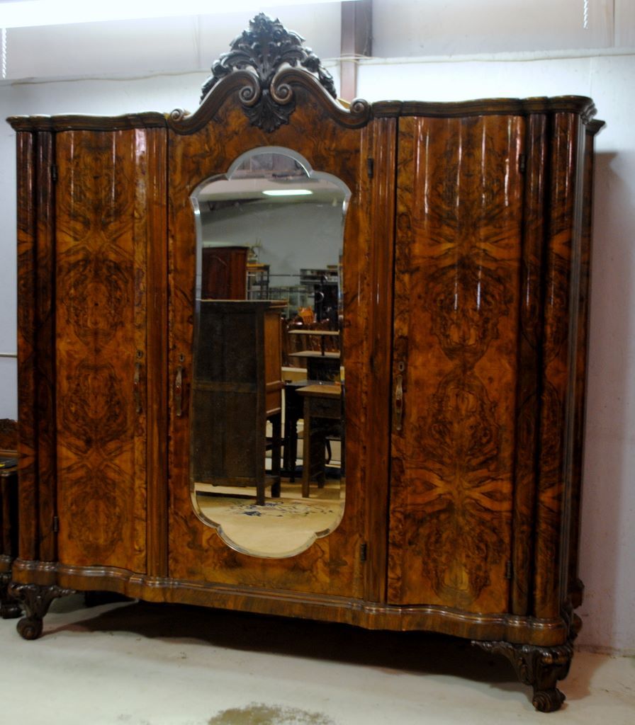 Continental Roccoco Style Burl Walnut Triple Section Wardrobe. Center section having heavy bevelled mirror door, carved cartouche (fitted inside with drawer and brass rod) Center door is flanked on each side by two doors with same elaborate burl walnut, metal pulls, interior fitted with shelves. All supported by Carved Roccoco foot. 84"w 24"d 97 1/2"h Continental Roccoco Style Burl Walnut Triple Section Wardrobe. Center section having heavy bevelled mirror door, carved cartouche (fitted inside with drawer and brass rod) Center door is flanked on each side by two doors with same elaborate burl walnut, metal pulls, interior fitted with shelves. All supported by Carved Roccoco foot. 84"w 24"d 97 1/2"h