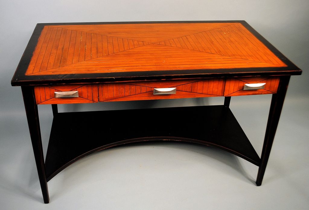 Black Lacquer Desk, Contemporary Straight legs, bottom shelf under three drawers that have stylish silver handles. Top has black border with lighter wood divided into pyramid design in center. Made by (label) Bassett, has matching side Chair. 50"w 28"d 30 1/2"h Black Lacquer Desk, Contemporary Straight legs, bottom shelf under three drawers that have stylish silver handles. Top has black border with lighter wood divided into pyramid design in center. Made by (label) Bassett, has matching side Chair. 50"w 28"d 30 1/2"h