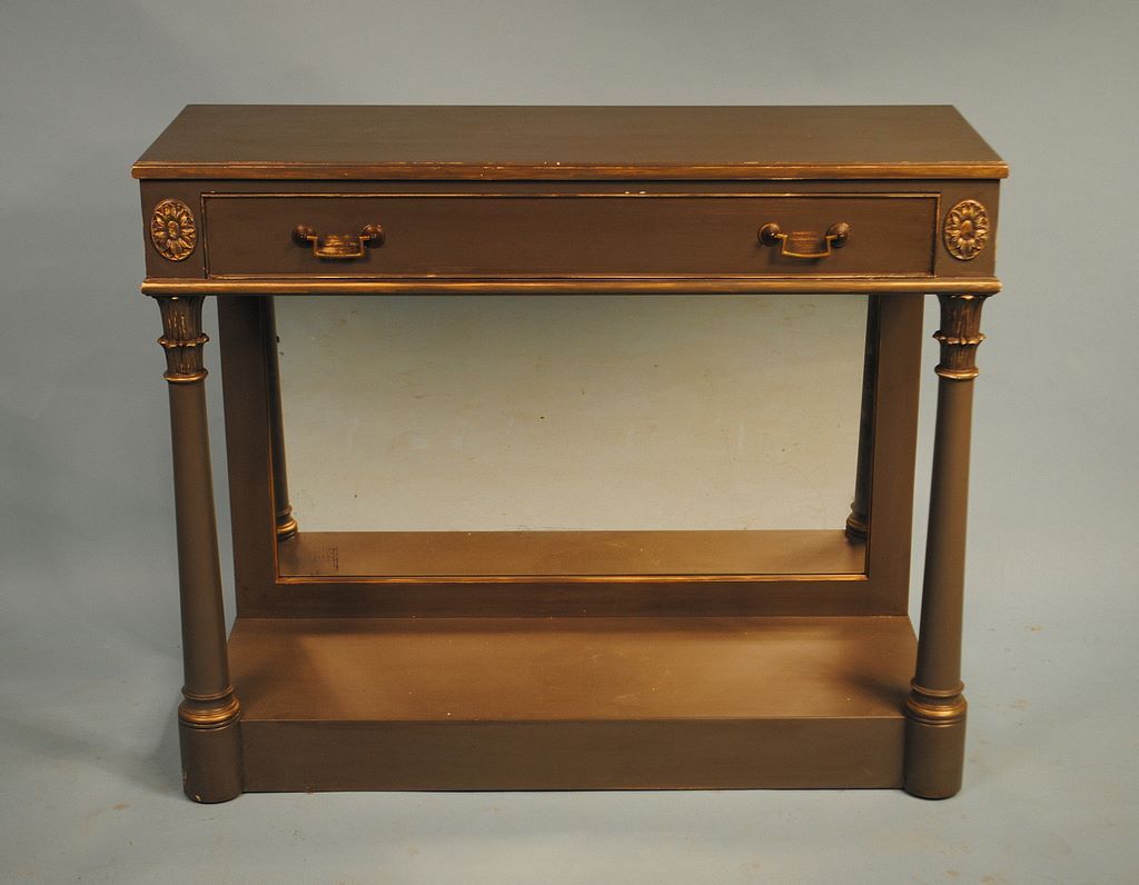 Antiqued Grey Empire Style Petit Coat Mirror. Top having center drawer with Rosettes on each end. Top supported by ionic columns with Mirror in Center. 44"w 16"d 36 1/2"h Antiqued Grey Empire Style Petit Coat Mirror. Top having center drawer with Rosettes on each end. Top supported by ionic columns with Mirror in Center. 44"w 16"d 36 1/2"h