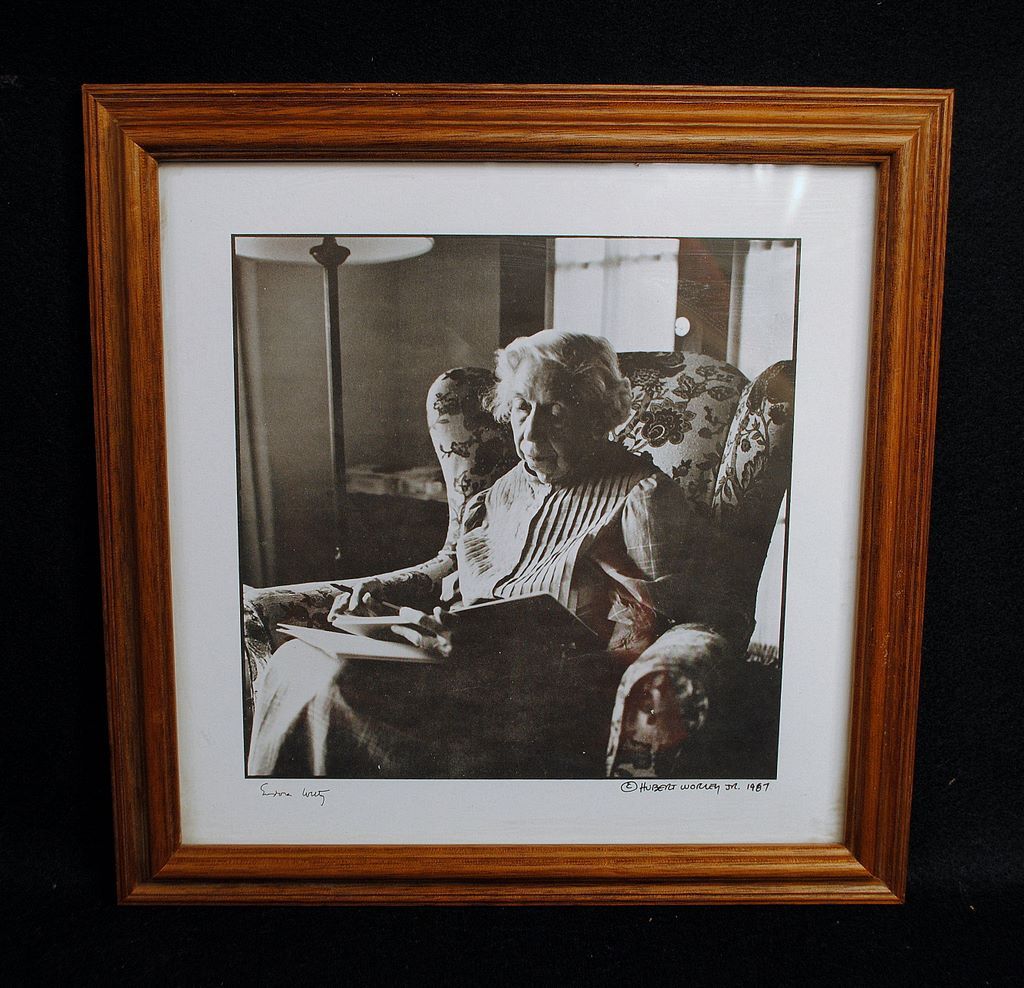 Autographed Copy Photo of Eudora Welty done by Hubert Worley Jr, in 1987. Simple Walnut Frame, 11 1/2 w 11 1/2 h. Worley is a native Mississippian, who has been a photographer over 40 years. In 1998, he received Ms Institute of Arts & Letters Photography Award for his exhibit "Ballerinas & Blues Men" Autographed Copy Photo of Eudora Welty done by Hubert Worley Jr, in 1987. Simple Walnut Frame, 11 1/2 w 11 1/2 h. Worley is a native Mississippian, who has been a photographer over 40 years. In 1998, he received Ms Institute of Arts & Letters Photography Award for his exhibit "Ballerinas & Blues Men"