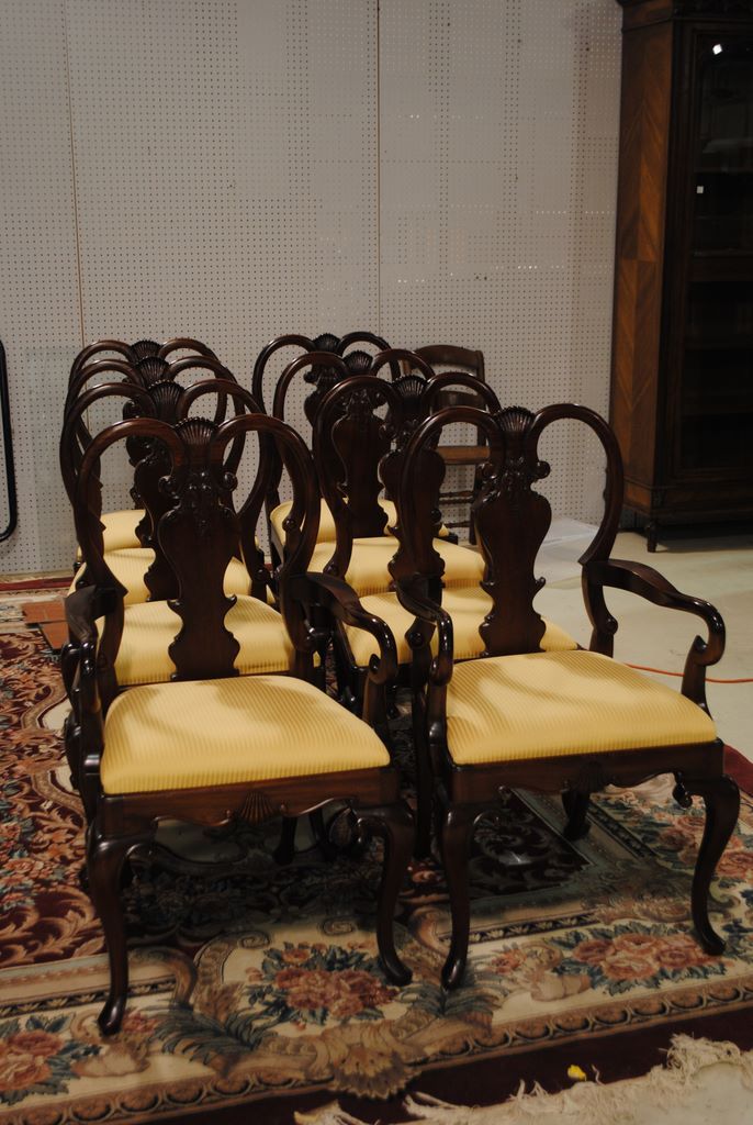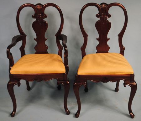 Set of Eight Mahogany Queen Anne Style Dining Chairs. C scrolled meeting into the center with shell carving. Nice wide seats. 40"h, 2 Arms, 6 sides Set of Eight Mahogany Queen Anne Style Dining Chairs. C scrolled meeting into the center with shell carving. Nice wide seats. 40"h, 2 Arms, 6 sides