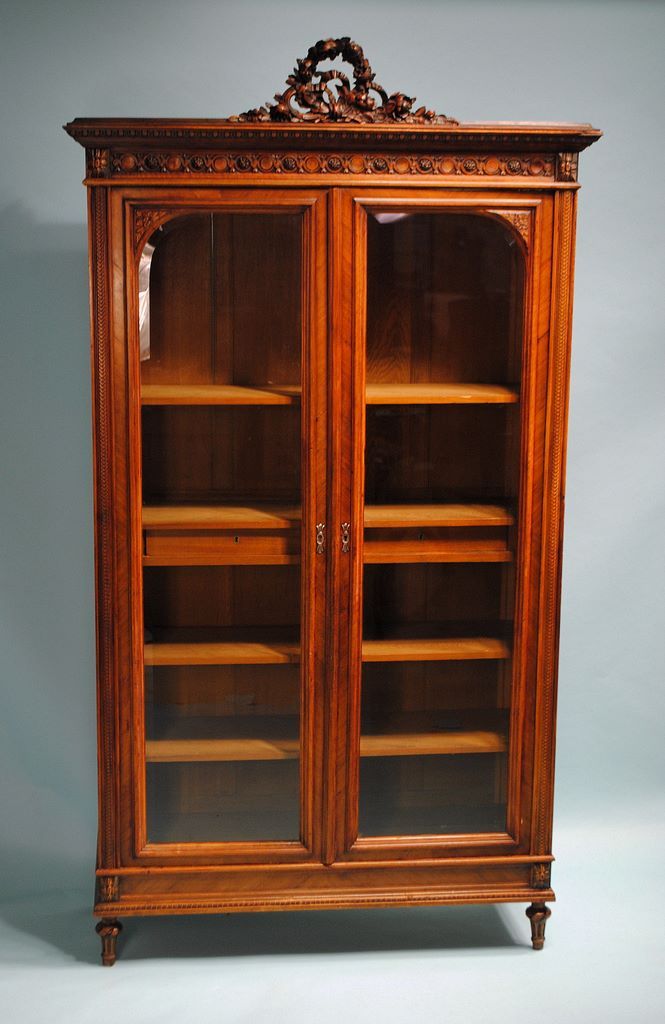 French Walnut Bookcase w/two bevel glass doors and interior fitted w/four shelves and two key entry drawers. Top intricately carved and finished w/a carved floral wreath at the crest. All up on turned feet. 99"h x 50"w x 17 1/2"d French Walnut Bookcase w/two bevel glass doors and interior fitted w/four shelves and two key entry drawers. Top intricately carved and finished w/a carved floral wreath at the crest. All up on turned feet. 99"h x 50"w x 17 1/2"d