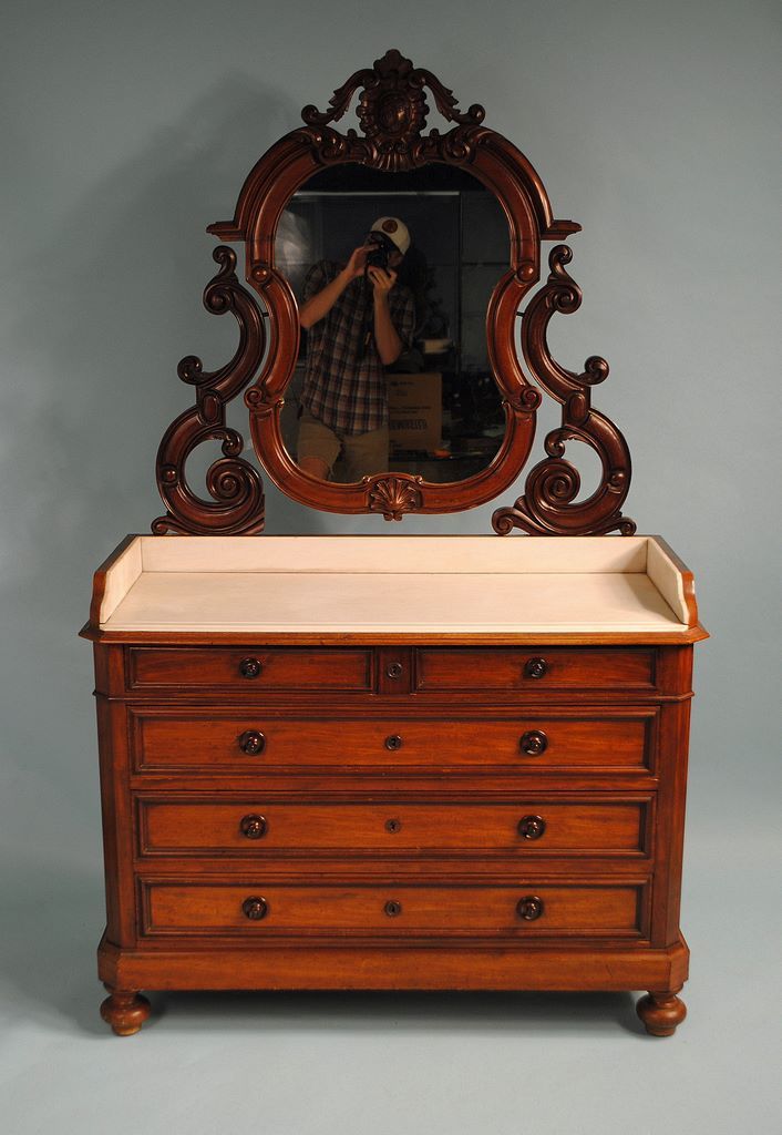 Mid 19th century marble inset, top dresser. Base has two small drawers over the larger drawers. Top has ornately carved mirror with S scroll arms. 75.5"h, 46"w, 18.5"d. Mid 19th century marble inset, top dresser. Base has two small drawers over the larger drawers. Top has ornately carved mirror with S scroll arms. 75.5"h, 46"w, 18.5"d.