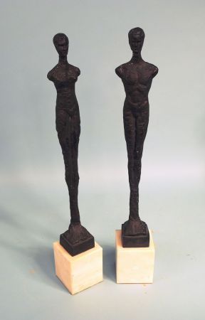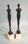Pair of Iron Figures of Men (no arms) on White Marble base. 20 3/8"h 3 1/4"sq. Pair of Iron Figures of Men (no arms) on White Marble base. 20 3/8"h 3 1/4"sq.