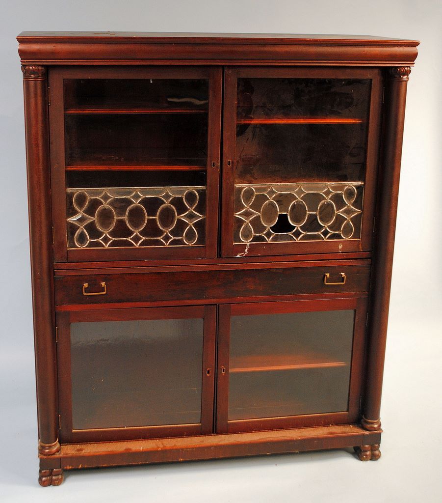 Early 20th Century Mahogany Bookcase. Two leaded glass doors interior fitted with shelves, long drawer over two glass doors on claw feet. Case has columns on each side. 48 1/2"w 17"d 50 1/2"h Early 20th Century Mahogany Bookcase. Two leaded glass doors interior fitted with shelves, long drawer over two glass doors on claw feet. Case has columns on each side. 48 1/2"w 17"d 50 1/2"h