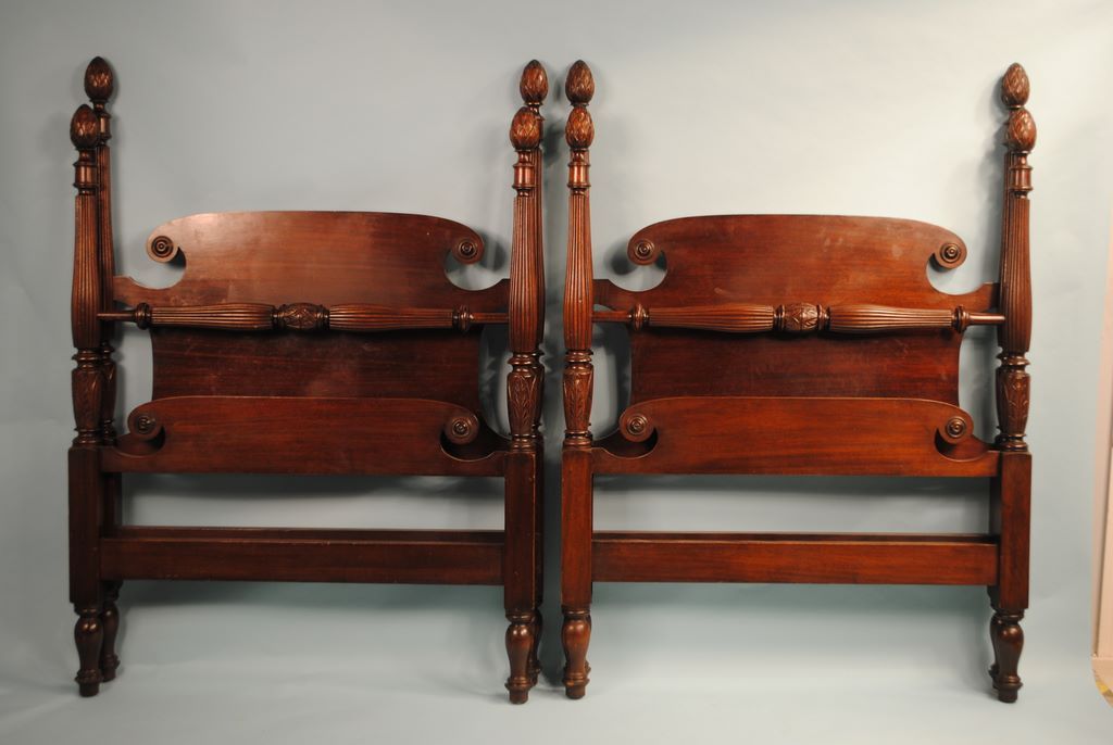 Pair of Mahogany Four Poster Twin Beds. Pineapple Carved Finials on each post. Southern Plantation style headboard, reeded posts, carved wheat. 58 1/2"h 42"w 76"L Pair of Mahogany Four Poster Twin Beds. Pineapple Carved Finials on each post. Southern Plantation style headboard, reeded posts, carved wheat. 58 1/2"h 42"w 76"L
