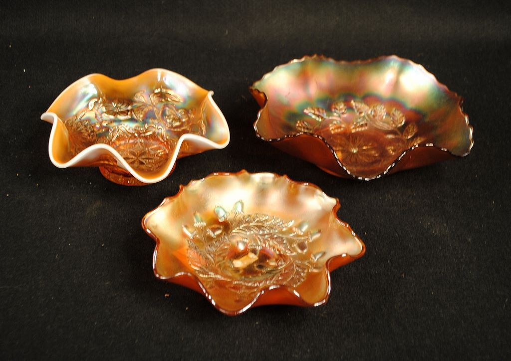 Includes one dugan/dogwood spray, dia. 7 3/4", one merigold acorn pattern bowl, dia. 7", and one merigold cosmos pattern dia. 10". Includes one dugan/dogwood spray, dia. 7 3/4", one merigold acorn pattern bowl, dia. 7", and one merigold cosmos pattern dia. 10".