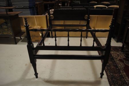 Early Dark Finish Spool Rope Bed. Simple Headboard with sausage turning on top, turned post. Rope rails. 47"w 63"L 44"h Early Dark Finish Spool Rope Bed. Simple Headboard with sausage turning on top, turned post. Rope rails. 47"w 63"L 44"h