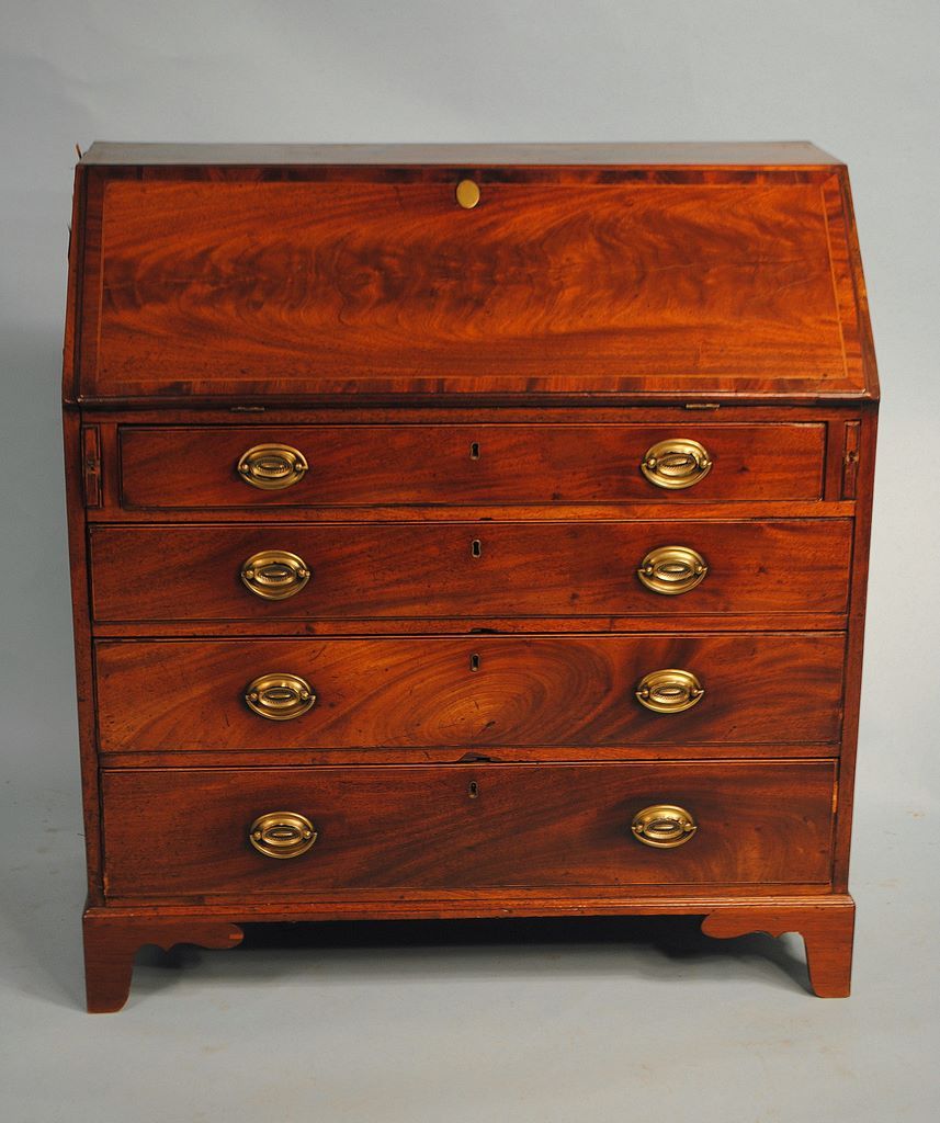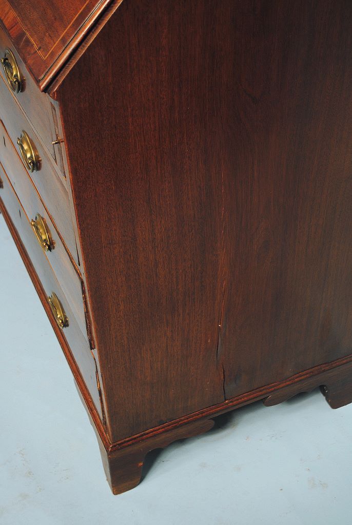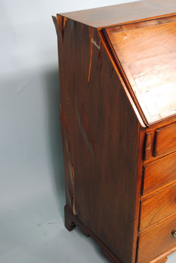 Walnut Slant-Lid Desk, interior fitted with small drawers and cubbyholes and a document door in center, the base has four graduated drawers on raised feet. Veneer damage on both sides 41"h x 19"d x 38"w Walnut Slant-Lid Desk, interior fitted with small drawers and cubbyholes and a document door in center, the base has four graduated drawers on raised feet. Veneer damage on both sides 41"h x 19"d x 38"w