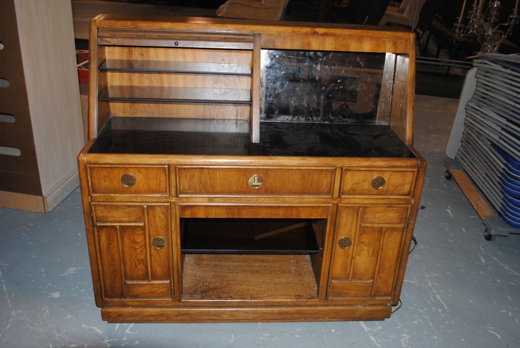 Modern desk with black painted top, slant top shelves, three drawers over two doors, oriental style hardware. 46"h, 48"w, 18"d. Modern desk with black painted top, slant top shelves, three drawers over two doors, oriental style hardware. 46"h, 48"w, 18"d.