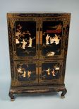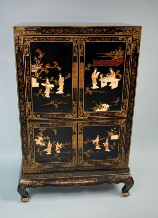 Black Lacquer Oriental Cabinet (no back). Two doors over two doors. Each door decorated in carved and painted oriental designs. Sides have carved and painted birds and magnolias. 36"w 20"d 59"h. Great for TV. Black Lacquer Oriental Cabinet (no back). Two doors over two doors. Each door decorated in carved and painted oriental designs. Sides have carved and painted birds and magnolias. 36"w 20"d 59"h. Great for TV.