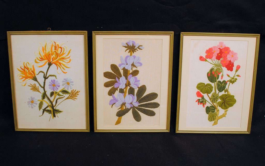 Set of Three Vintage Embroidered Flowers on Linen. In decorative Green Frames. 12 3/4"w 17"h Set of Three Vintage Embroidered Flowers on Linen. In decorative Green Frames. 12 3/4"w 17"h