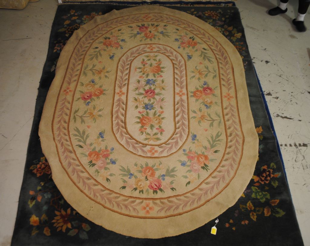 Oval Vintage Hook Rug in Cream Background, colorful floral design. 10.5'L, 7'10"W. Oval Vintage Hook Rug in Cream Background, colorful floral design. 10.5'L, 7'10"W.