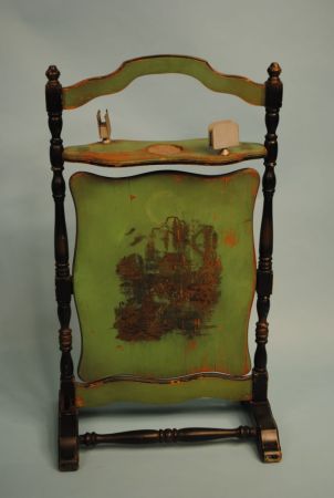 Table tilts, painted green (some wear), top has match holders. Unique piece. 33"h, 18.5"w. Table tilts, painted green (some wear), top has match holders. Unique piece. 33"h, 18.5"w.
