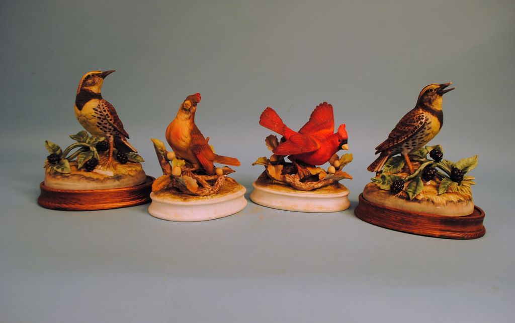 Two sets of Bisque Male and Female Meadow Larks by Andrea on wood bases, 8"w, along with a Male and Female Cardinal, 6"h , 8"h. Two sets of Bisque Male and Female Meadow Larks by Andrea on wood bases, 8"w, along with a Male and Female Cardinal, 6"h , 8"h.