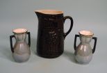 Stoneware Pitcher in Brown with Grape and Vine design, 8 1/2"h. Along with two blue Lusterware vases. Marked made in Czechoslovakia, age crack in one, 5 1/2"h Stoneware Pitcher in Brown with Grape and Vine design, 8 1/2"h. Along with two blue Lusterware vases. Marked made in Czechoslovakia, age crack in one, 5 1/2"h