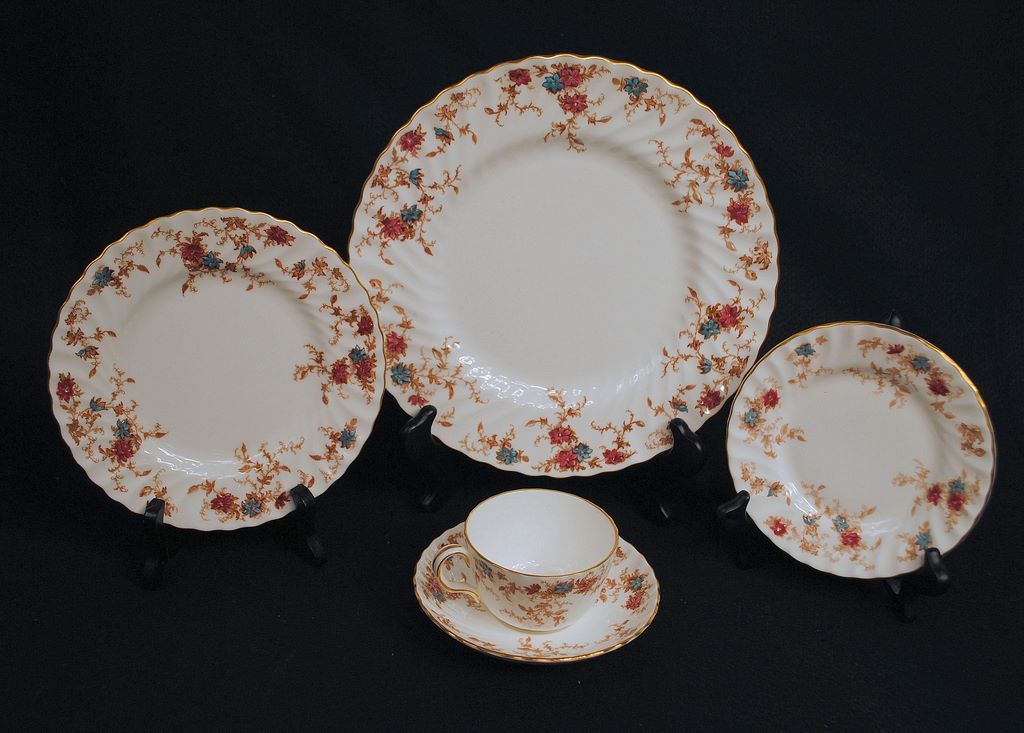 Set of Minton China Ancestral Pattern, 12 each of Dinner Plate, Bread Plate, Salad Plate and Cup with Saucer. All in Excellent Condition with no chips other than one saucer. Set of Minton China Ancestral Pattern, 12 each of Dinner Plate, Bread Plate, Salad Plate and Cup with Saucer. All in Excellent Condition with no chips other than one saucer.