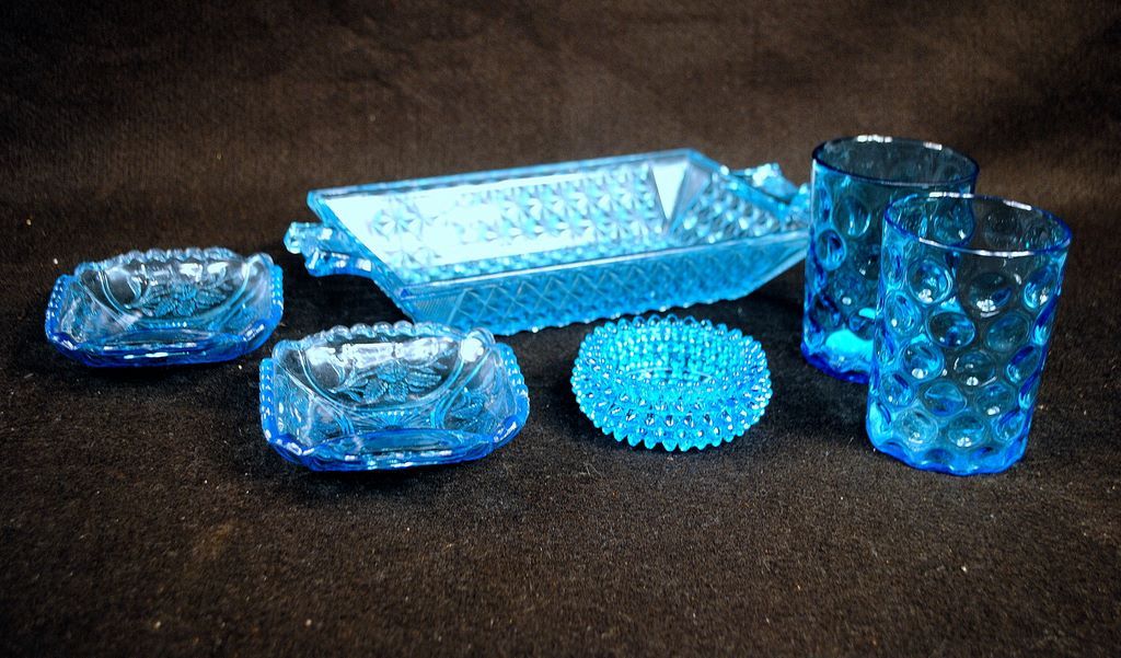 Group of Victorian Blue Glass items, Two coin dot glasses 4 1/2"h, Hobnail master Salt 4"dia., Two small single handle square bowls 5"sq., One double handle rectangular bowl 11 1/2" L 6 1/2"w Group of Victorian Blue Glass items, Two coin dot glasses 4 1/2"h, Hobnail master Salt 4"dia., Two small single handle square bowls 5"sq., One double handle rectangular bowl 11 1/2" L 6 1/2"w
