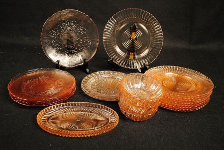 Group of Pink Depression Glass(23 pieces). Consist of: six - 2 3/8" plates, six - 71/2" plates, ten - 8" plates, one 8" dish, four - 4" bowls. Group of Pink Depression Glass(23 pieces). Consist of: six - 2 3/8" plates, six - 71/2" plates, ten - 8" plates, one 8" dish, four - 4" bowls.
