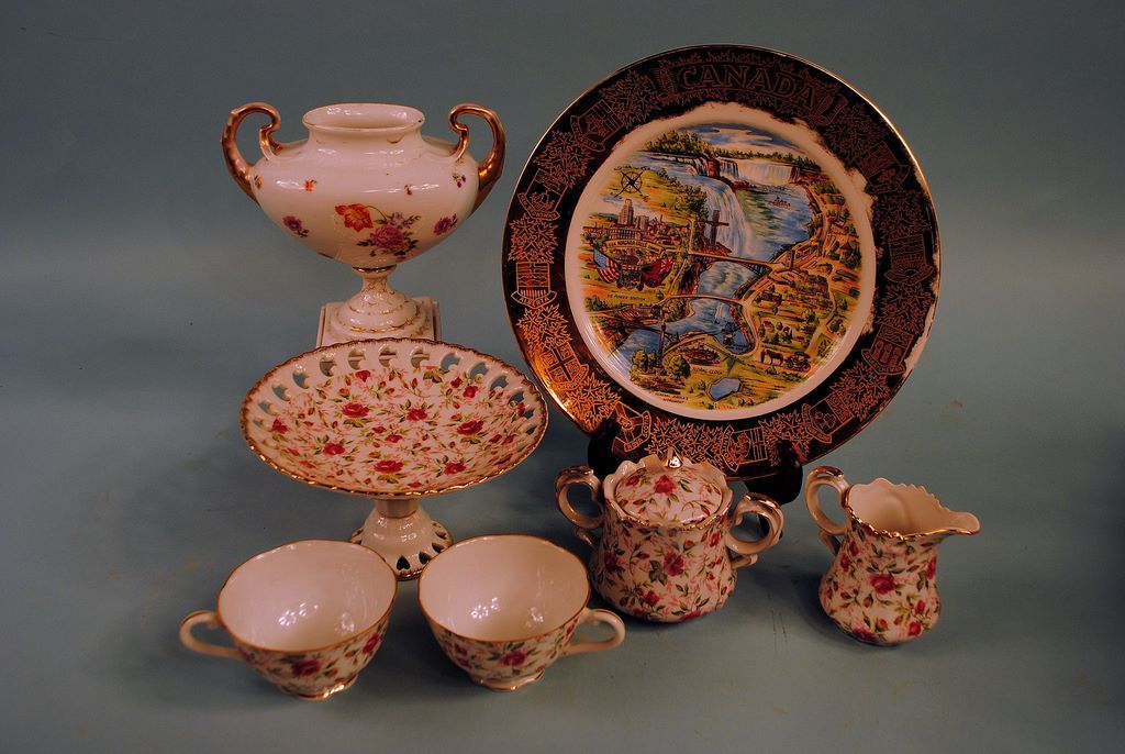 Seven Piece Group Of Porcelain which include hand painted Urn with courtship painting signed Boueher, 9 3/4"h, Plate marked made in West Germany 10 1/2" plate. Hand-painted Lofton China ( 4 1/2" compote, 2 cups, covered sugar-chip on base of creamer, 3 1/2"h Seven Piece Group Of Porcelain which include hand painted Urn with courtship painting signed Boueher, 9 3/4"h, Plate marked made in West Germany 10 1/2" plate. Hand-painted Lofton China ( 4 1/2" compote, 2 cups, covered sugar-chip on base of creamer, 3 1/2"h