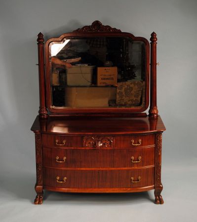 Beautiful Flame Mahogany Dresser w/three small drawers over two large drawers and bevel glass mirror supported by columns on each side. Intricate carving along edges and all supported on raised paw feet. (Match for Lot 398). Dresser 32 1/2"h x 26"d x 55"w; mirror 40"h x 45"w Beautiful Flame Mahogany Dresser w/three small drawers over two large drawers and bevel glass mirror supported by columns on each side. Intricate carving along edges and all supported on raised paw feet. (Match for Lot 398). Dresser 32 1/2"h x 26"d x 55"w; mirror 40"h x 45"w