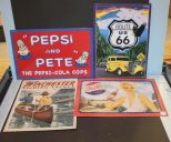 132 Tin Pepsi-Cola Sign, Winchester Fishing Tackle Sign, Route US 66 Sign, Pete and Pepsi Sign Tin Pepsi-Cola Sign 17"w., 12"h., Winchester Fishing Tackle Sign 12"w., 16"h., Route US 66 Sign, Pete and Pepsi Sign 17"w., 11"h.