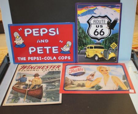 Tin Pepsi-Cola Sign, Winchester Fishing Tackle Sign, Route US 66 Sign, Pete and Pepsi Sign Tin Pepsi-Cola Sign 17"w., 12"h., Winchester Fishing Tackle Sign 12"w., 16"h., Route US 66 Sign, Pete and Pepsi Sign 17"w., 11"h. Tin Pepsi-Cola Sign, Winchester Fishing Tackle Sign, Route US 66 Sign, Pete and Pepsi Sign Tin Pepsi-Cola Sign 17"w., 12"h., Winchester Fishing Tackle Sign 12"w., 16"h., Route US 66 Sign, Pete and Pepsi Sign 17"w., 11"h.